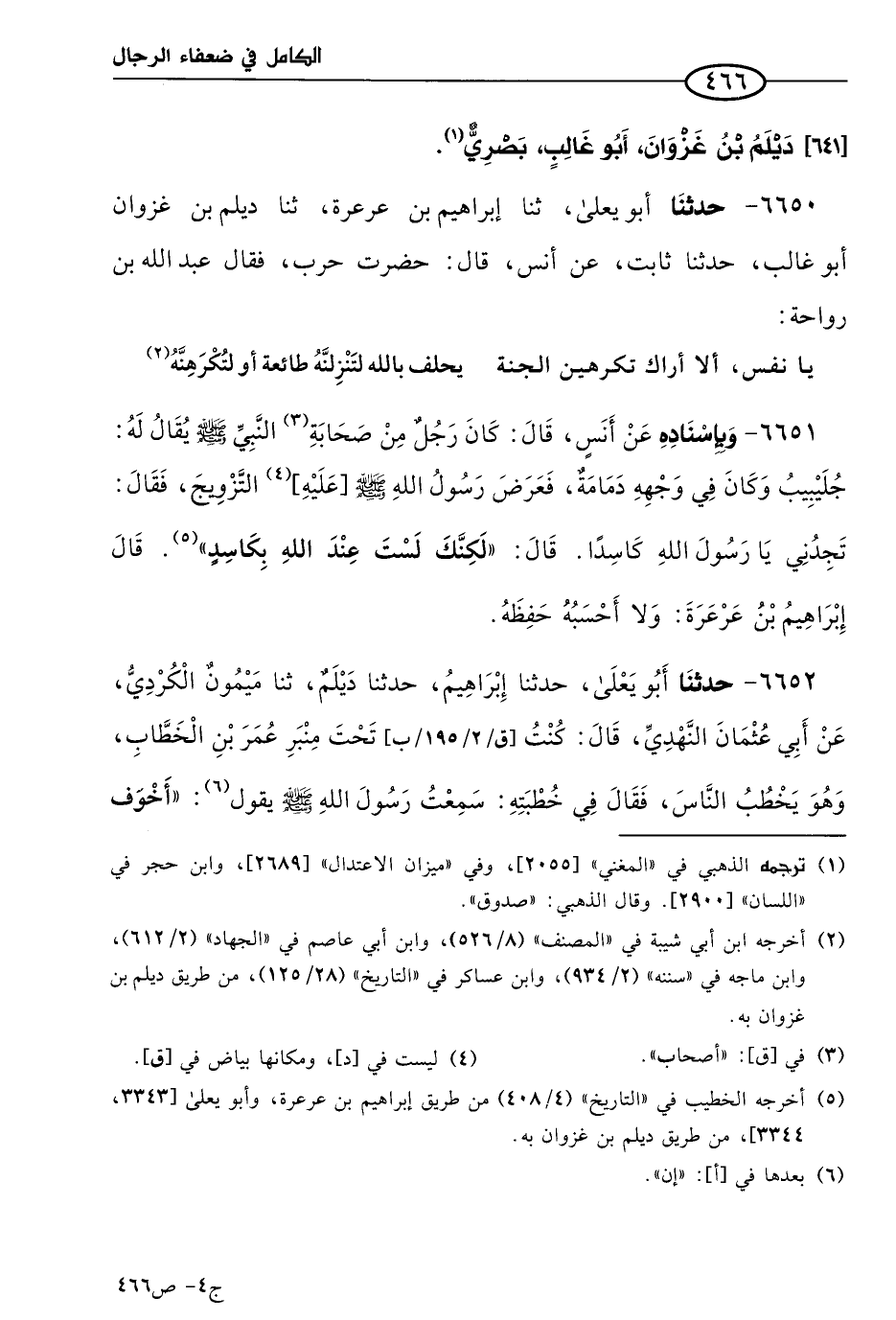 6650 - حَدثنا أَبو يعلَى، حَدثنا إبراهيم بن عرعرة، حَدثنا ديلم بن غزوان أَبو غالب، حَدثنا ثابت، عن أَنَس قال: حضرت حرب، فقال عَبد الله بن رواحة:.