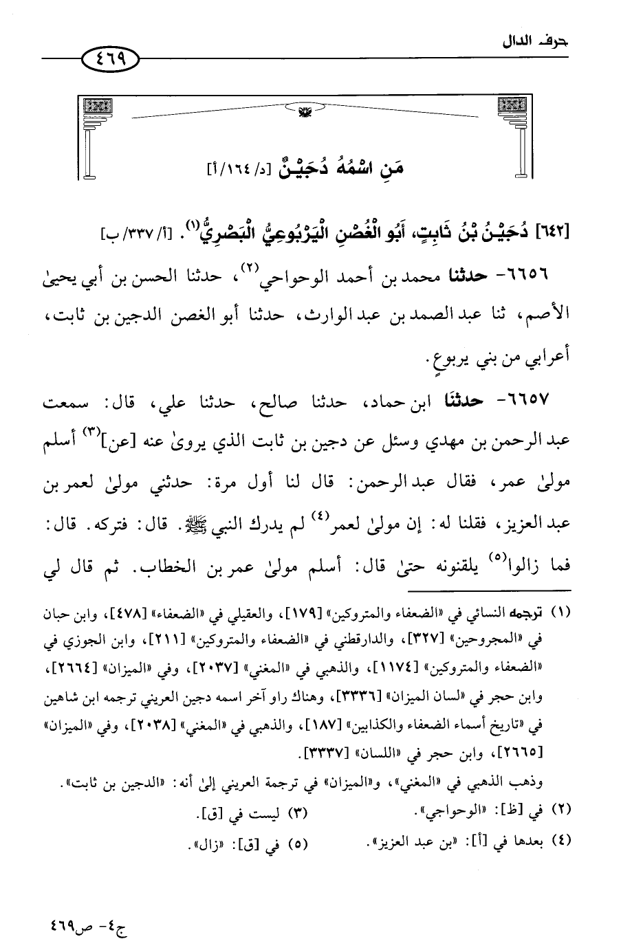 6657 - حَدثنا ابن حماد، حَدثنا صالح، حَدثنا علي، قال: سمعتُ عَبد الرحمن بن مهدي، وسُئِل عن دجين بن ثابت، الذي يروى عنه، عن أسلم مولى عُمر، فقال عَبد الرحمن: قال لنا أول مرة: حَدَّثني مولى لعمر بن عَبد العزيز، فقلنا له: إن مولى لعُمر لم يدرك النبي صَلى الله عَليه وسَلم، قال: فتركه، قال: فما زالوا يلقنونه حتى قال: أسلم مولى عُمر بن الخطاب، ثم قال لي عَبد الرحمن: لا تعتد به. وقال: كان يوهمه، ولا يدري ما هو، ويقول: مولى عُمر بن عَبد العزيز.