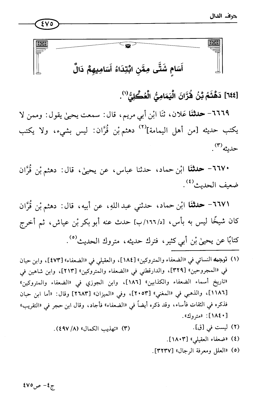 6670 - حَدثنا ابن حماد، حَدثنا عباس، عن يحيى، قال: دهثم بن قران ضعيف الحديث.