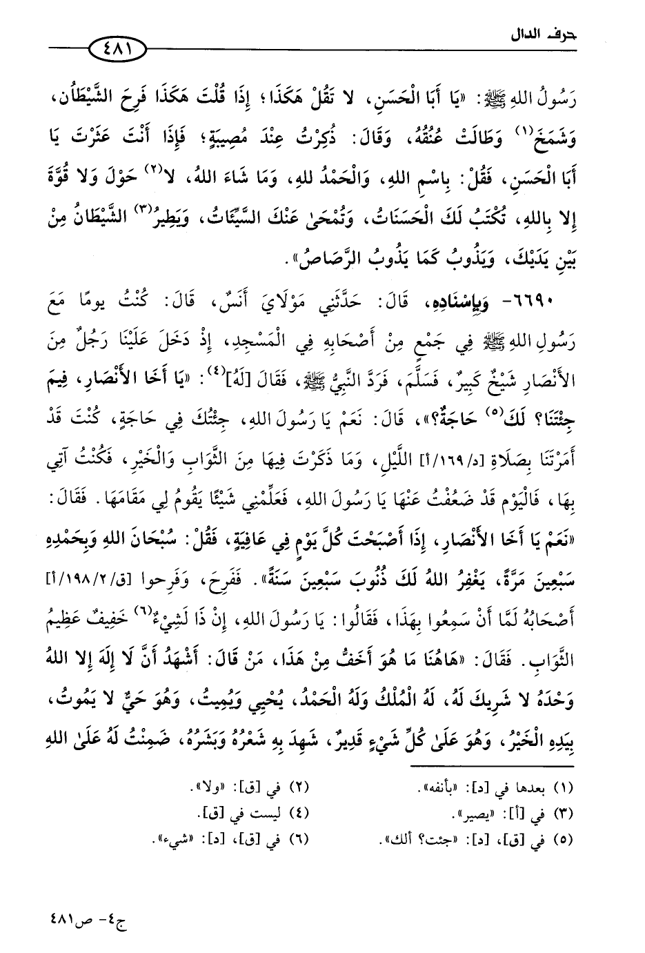 6690 - وبإسناده (1)؛ قال: حَدَّثني مولاي أنس قال: كنتُ يوما مع رسول الله صَلى الله عَليه وسَلم في جمع من أصحابه في المسجد، إذ دخل علينا رجل من الأنصار شيخ كبير، فسلم، فرد النبي صَلى الله عَليه وسلم فقال له: يا أخا الأنصار، فيم جئتنا؟ لك حاجة؟ قال: نَعم يا رسول الله، جئتك في حاجة، كنت قد أمرتنا بصلاة الليل، وما ذكرت فيها من الثواب والخير، فكنت آتي بها، فاليوم قد ضعفت عنها يا رسول الله، فعلمني شيئا يقوم لي مقامها، فقال: نعم يا أخا الأنصار إذا أصبحت كل يوم في عافية فقل: سبحان الله وبحمده سبعين مرة يغفر الله لك ذنوب سبعين سنة، ففرح وفرحوا أصحابه (2)، لما أن سمعوا بهذا، فقالوا: يا رسول الله، إن ذا لشيء خفيف عظيم الثواب، فقال: هَاهُنا ما هو أخف من هذا، من قال: أشهد أن لا إله إلا الله وحده لا شَريك له، له الملك وله الحمد يحيى ويميت، وهو حي لا يموت بيده الخير، وهو على كل شيء قدير، شهد به شعره وبشره، ضمنت له على الله الجنة، ومن قام منكم فتوضأ وأسبغ الوضوء وصلى ركعتين، لم يرد بهما غير الله ضمنت له على الله الجنة.