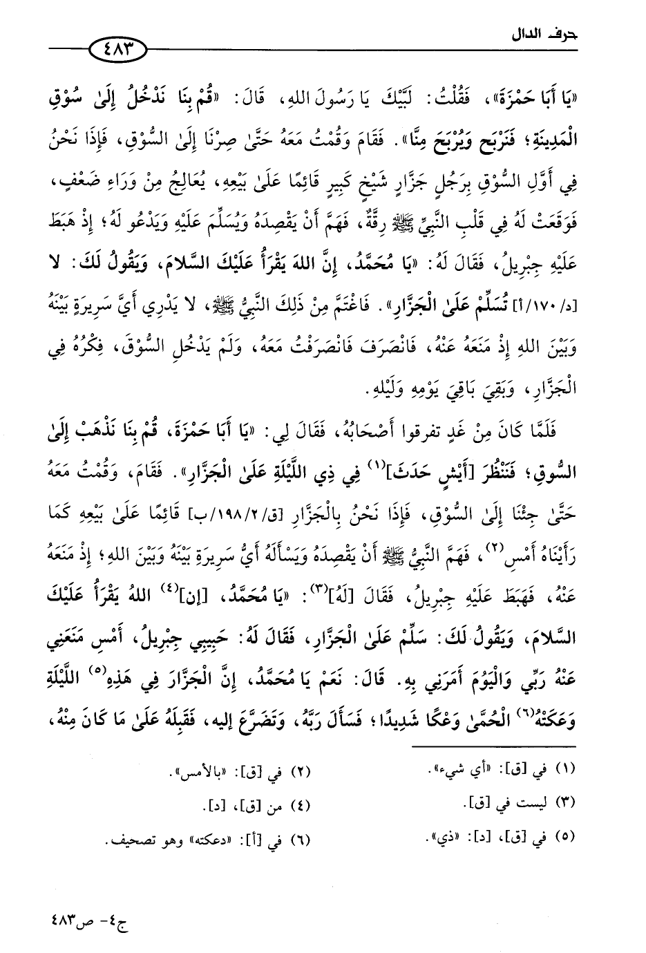 فلما كان من غد، تفرقوا أصحابه (2)، فقال لي: يا أبا حمزة، قم بنا نذهب إلى السوق فننظر أيش حدث في ذي الليلة علي الجزار، فقام وقمت معه، حتى جئنا إلى السوق فإذا نحن بالجزار قائما على بيعه كما رأيناه أمس، فهم النبي صَلى الله عَليه وسلم أن يقصده ويسأله، أي سريرة بينه وبين الله إذ منعه عنه، فهبط عليه جبريل، فقال له: يا مُحمد الله يقرأ عليك السلام ويقول لك: سلم على الجزار، فقال له: حبيبي جبريل، أمس منعني عنه ربي واليوم أمرني به؟ قال: نَعم يا مُحمد، إن الجزار في هذه الليلة وعكته الحمى وعكا شديدا فسأل ربه، وتضرع إليه، فقبله على ما كان منه، فاقصده يا مُحمد، وسلم عليه وبشره، فإن الله قد قبله على ما كان منه، فقصده فسلم عليه وبشره وانصرف وانصرفت معه.