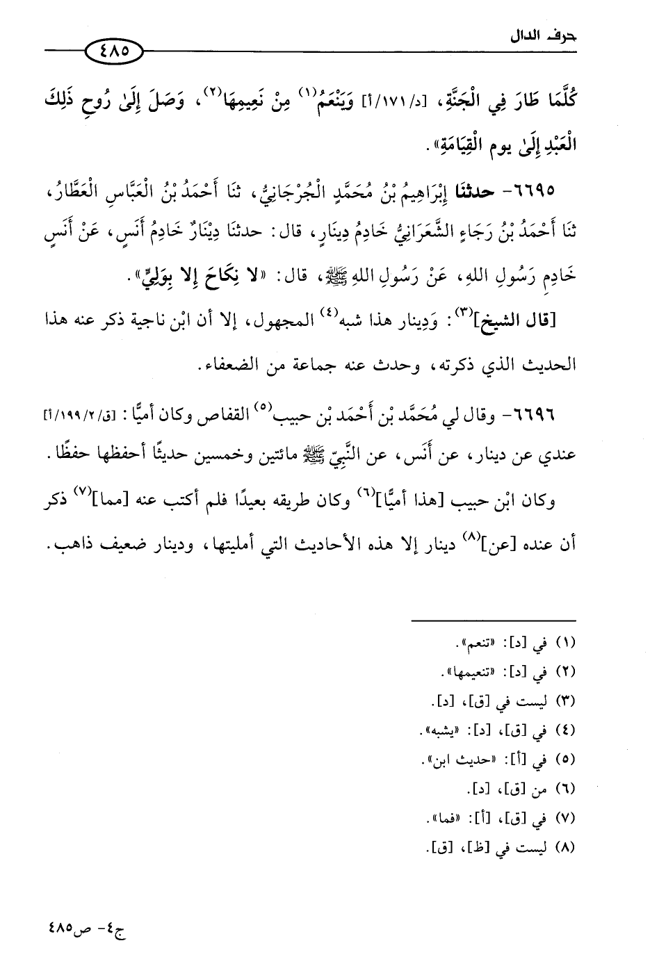 6695 - حَدثنا إبراهيم بن مُحمد الجرجاني، حَدثنا أحمد بن العباس العطار، حَدثنا أحمد بن رجاء الشعراني خادم دينار، قال: حَدثنا دينار خادم أنس، عن أَنَس خادم رسول الله صَلى الله عَليه وسَلم، عن رسول الله صَلى الله عَليه وسَلم قال: لا نكاح إلا بولي.