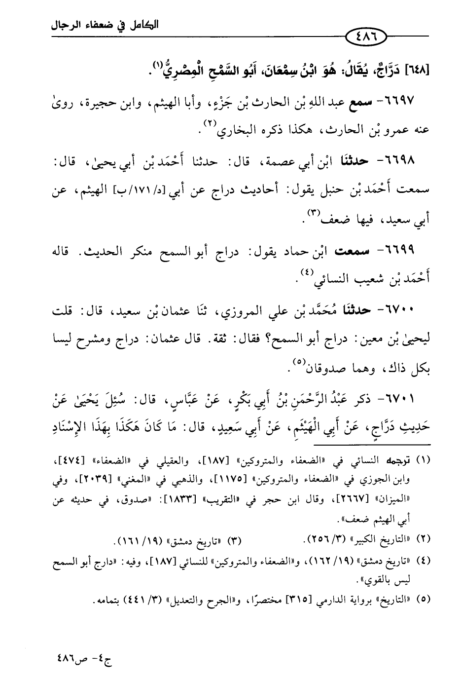 6699 - سمعتُ ابن حماد يقول: دراج أَبو السمح منكر الحديث، قاله أحمد بن شُعَيب النسائي.