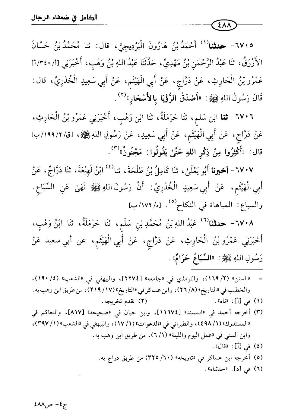 6705 - حَدثنا أحمد بن هارون البرديجي، قال: حَدثنا مُحمد بن حسان الأزرق، حَدثنا عَبد الرحمن بن مهدي، حَدثنا عَبد الله بن وهب، أخبرني عَمرو بن الحارث، عن دراج، عن أبي الهيثم، عن أبي سعيد الخدري، قال: قال رسول الله صَلى الله عَليه وسلم: أصدق الرؤيا بالأسحار.