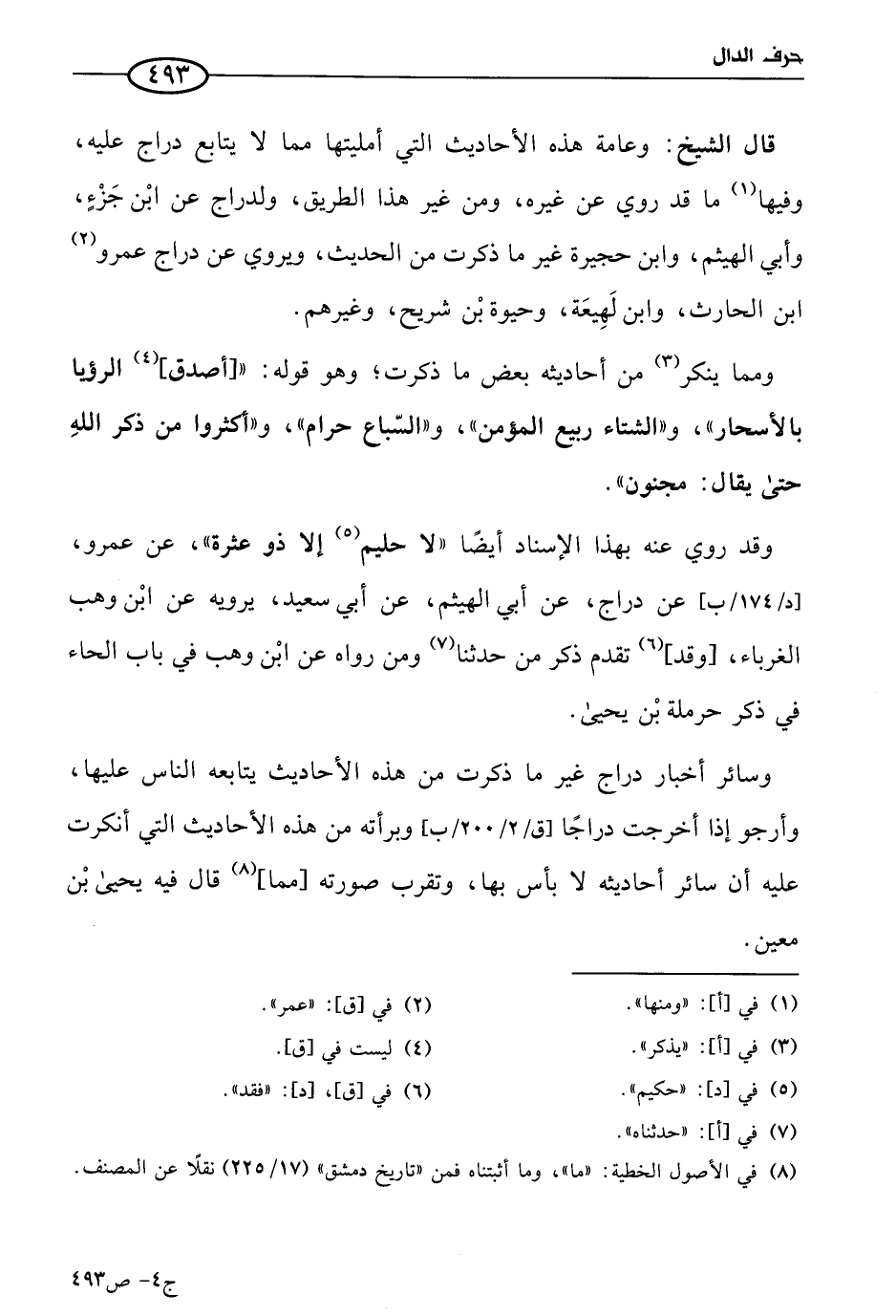 قال الشيخ: وعامة هذه الأحاديث التي أمليتها مما لا يتابع دراج عليه، وفيها ما قد روى عن غيره، ومن غير هذا الطريق، ولدراج، عن ابن جزء، وأبي الهيثم وابن حجيرة غير ما ذكرت من الحديث، ويروي عن دراج عَمرو بن الحارث، وابن لَهيعَة، وحيوة بن شريح وغيرهم.