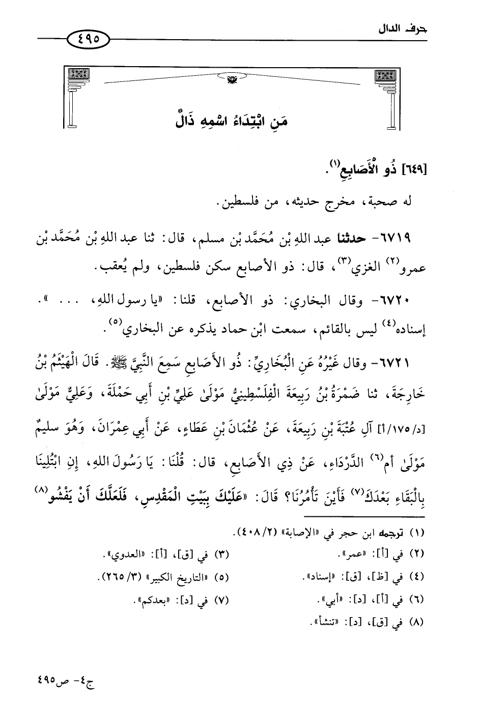 6721 - وقال غيره، عن البُخاري: ذو الأصابع سمع النبي صَلى الله عَليه وسَلم. قال الهيثم بن خارجة: حَدثنا ضمرة بن ربيعة الفلسطيني مولى علي بن أبي حملة، وعلي مولى آل عتبة بن ربيعة، عن عثمان بن عطاء، عن أبي عمران، وهو سليم مولى أُم الدرداء، عن ذي الأصابع قال: قلنا: يا رسول الله، إن ابتلينا بالبقاء بعدك، فأين تأمرنا؟ قال: عليك ببيت المقدس، فلعلك أن يفشو لك ذرية، يغدون إلى ذلك المجلس ويروحون.