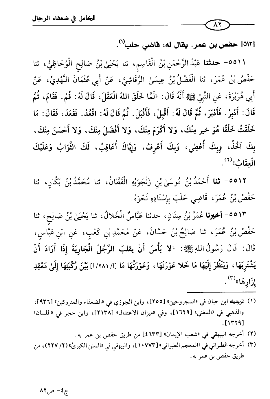 5511 - حَدثنا عَبد الرحمن بن القاسم، حَدثنا يَحيى بن صالح الوحاظي، حَدثنا حفص بن عُمر، حَدثنا الفضل بن عيسى الرقاشي، عن أبي عثمان النهدي، عن أبي هريرة، عن النبي صَلى الله عَليه وسلم أنه قال: لما خلق الله العقل قال له: قم، فقام، ثم قال: أدبر، فأدبر، ثم قال له: أقبل، فأقبل، ثم قال له: اقعد، فقعد، فقال: ما خلقت خلقا هو خير منك، ولا أكرم منك، ولا أفضل منك، ولا أحسن منك، بك آخذ وبك أعطي وبك أعرف وإياك أعاقب، لك الثواب وعليك العقاب.