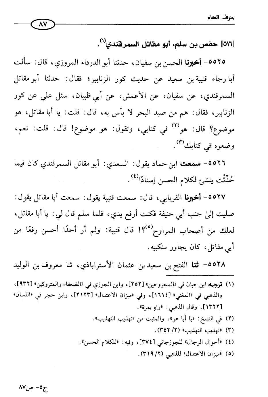 5525 - أخبرنا الحسن بن سفيان، حَدثنا أَبو الدرداء المروزي، قال: سَألتُ أبا رجاء قتيبة بن سعيد، عن حديث كور الزنابير، فقال: حَدثنا أَبو مقاتل السمرقندي، عن سُفيان، عن الأَعمَش، عن أبي ظبيان؛ سئل علي، عن كور الزنابير، فقال: هم من صيد البحر، لا بأس به. قال: قلتُ: يا أبا مقاتل، هو موضوع؟ قال: بابا هو في كتابي وتقول: هو موضوع! قال: قلتُ: نَعَم، وضعوه في كتابك.