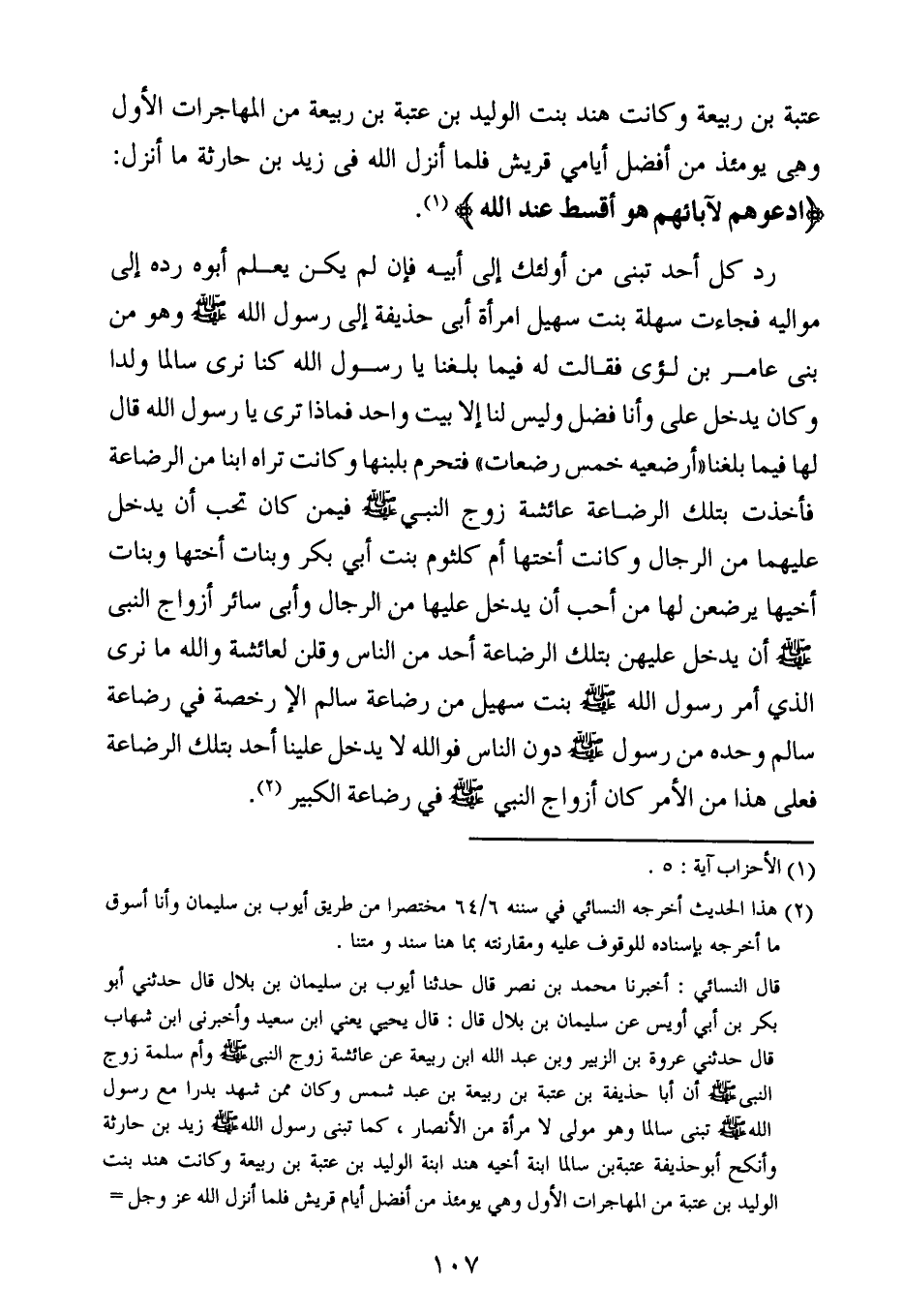 رد كل أحد تبني من أولئك إلى أبيه فإن لم يكن يعلم أبوه رده إلى مواليه فجاءت سهلة بنت سهيل امرأة أبي حذيفة إلى رسول الله صلى الله عليه وسلم ، وَهُو من بني عامر بن لؤي فقالت له فيما بلغنا يارسول الله كنا نرى سالما ولدا ، وكان يدخل علي وأنا فضل وليس لنا إلا بيت واحد فماذا ترى يارسول الله قال لها فيما بلغنا أرضعيه خمس رضعات فتحرم بلبنها وكانت تراه ابنا من الرضاعة فأخذت بتلك الرضاعة عائشة زوج النبي صلى الله عليه وسلم فيمن كان تحب أن يدخل عليهما من الرجال وكانت أختها أم كلثوم بنت أبي بكر وبنات أختها وبنات أخيها يرضعن لها