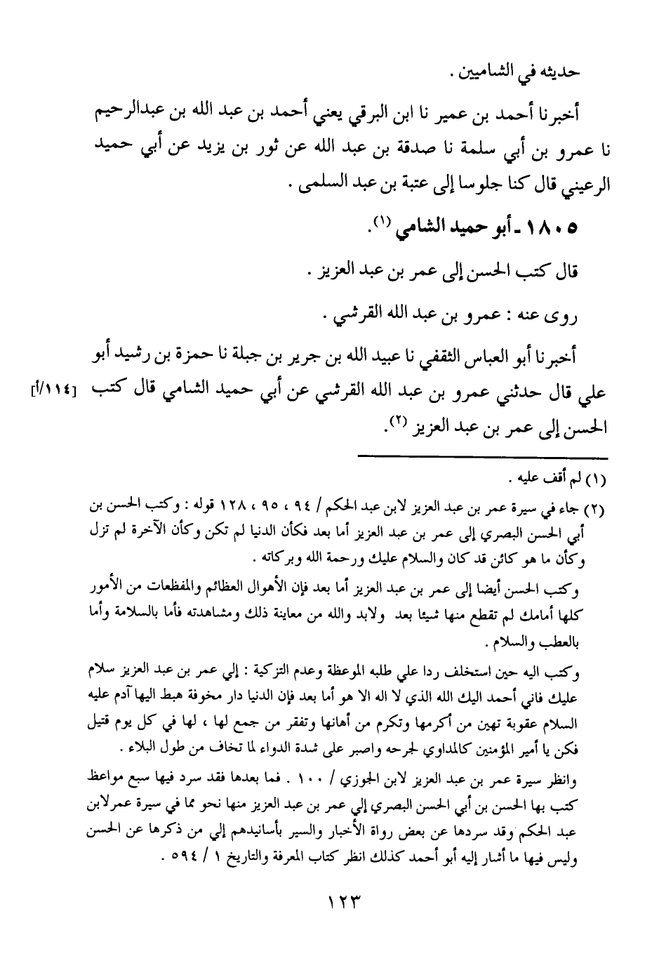 أخبرنا أبو العباس الثقفي ، حَدَّثنا عبيد الله بن جرير ، حَدَّثنا حمزة بن رشيد أبو علي ، قال : حَدَّثني عَمْرو بن عبد الله القرشي عن أبي حميد الشامي قال كتب الحسن إلى عُمَر بن عبد العزيز.