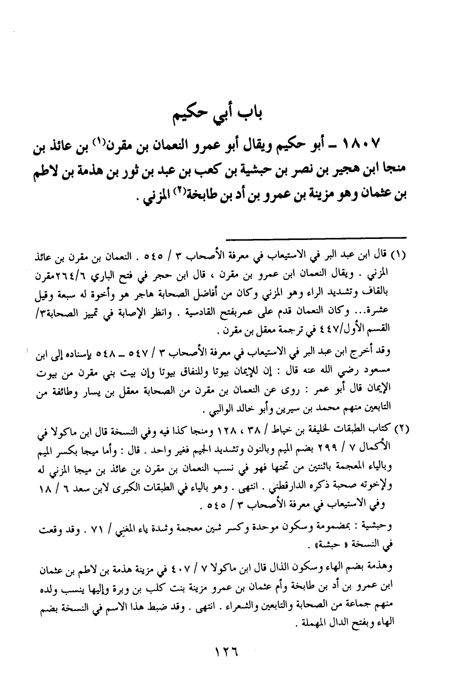1807- أبو حكيم ، وَيُقَال : أبو عَمْرو النعمان بن مقرن بن عائذ بن منجا ابن هجير بن نصر بن حبشية بن كعب بن عبد بن ثور بن هذمة بن لاطم بن عثمان ، وَهُو مزينة بن عَمْرو بن أد بن طابخة المزني.