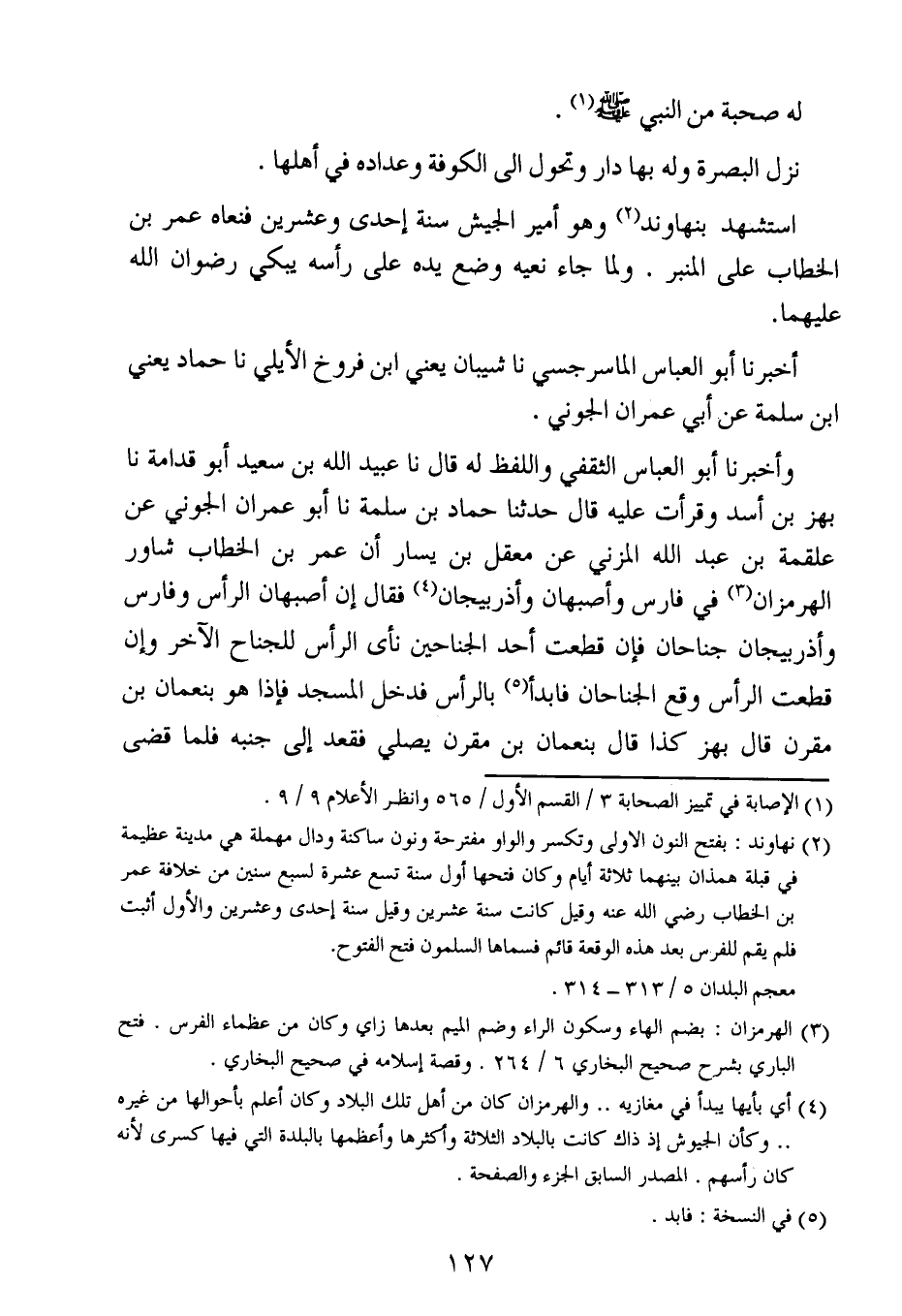 وقرأت عليه ، قال : حَدَّثنا حماد بن سلمة ، حَدَّثنا أبو عمران الجوني عن علقمة بن عبد الله المزني عن معقل بن يسار أن عُمَر بن الخطاب شاور الهرمزان في فارس وأصبهان وأذربيجان فقال إن أصبهان الر أس وفارس وأذربيجان جناحان فإن قطعت أحد الجناحين نأى الرأس للجناح الآخر وإن قطعت الرأس وقع الجناحان فابدأ بالرأس فدخل المسجد فإذا هو بنعمان بن مقرن قال بهز كذا قال بهز كذا قال بنعمان بن مقرن يصلي فقعد إلى جنبه فلما قضى صلاته قال ما أراني إلا مستعملك قال أما جابيا فلا ولكن غازيا قال فلا بل غازيا.