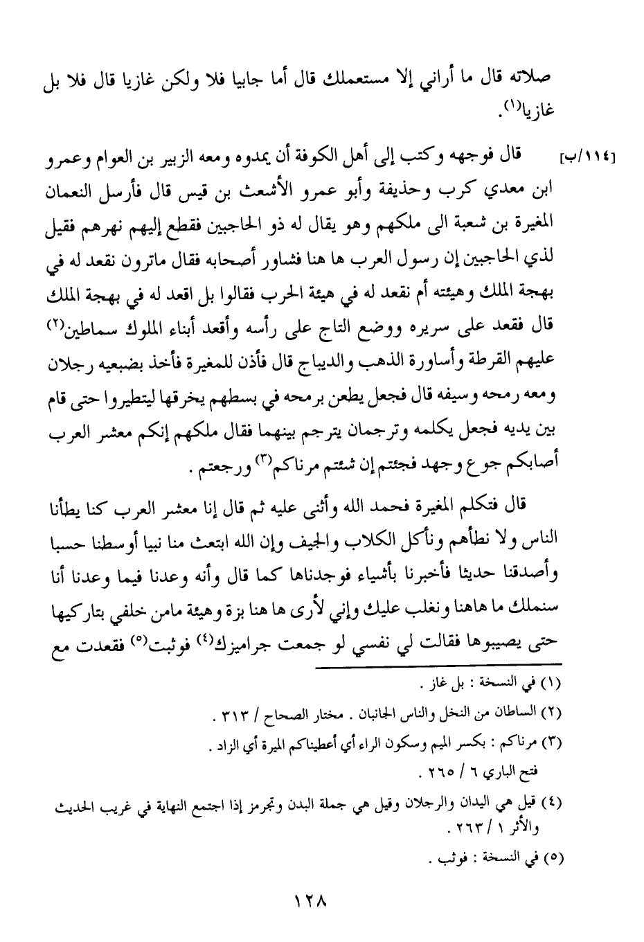 قال قأذن للمغيرة فأخذ بضبعية رجلان ومعه رمحه وسيفه قال فجعل يطعن برمحه في بسطهم يخرقها ليتطيروا حتى قام بين يديه فجعل يكلمه وترجمان يترجم بينهما فقال ملكهم إنكم معشر العرب أصابكم جوع وجهد فجئتم إن شئتم مرناكم ورجعتم.
