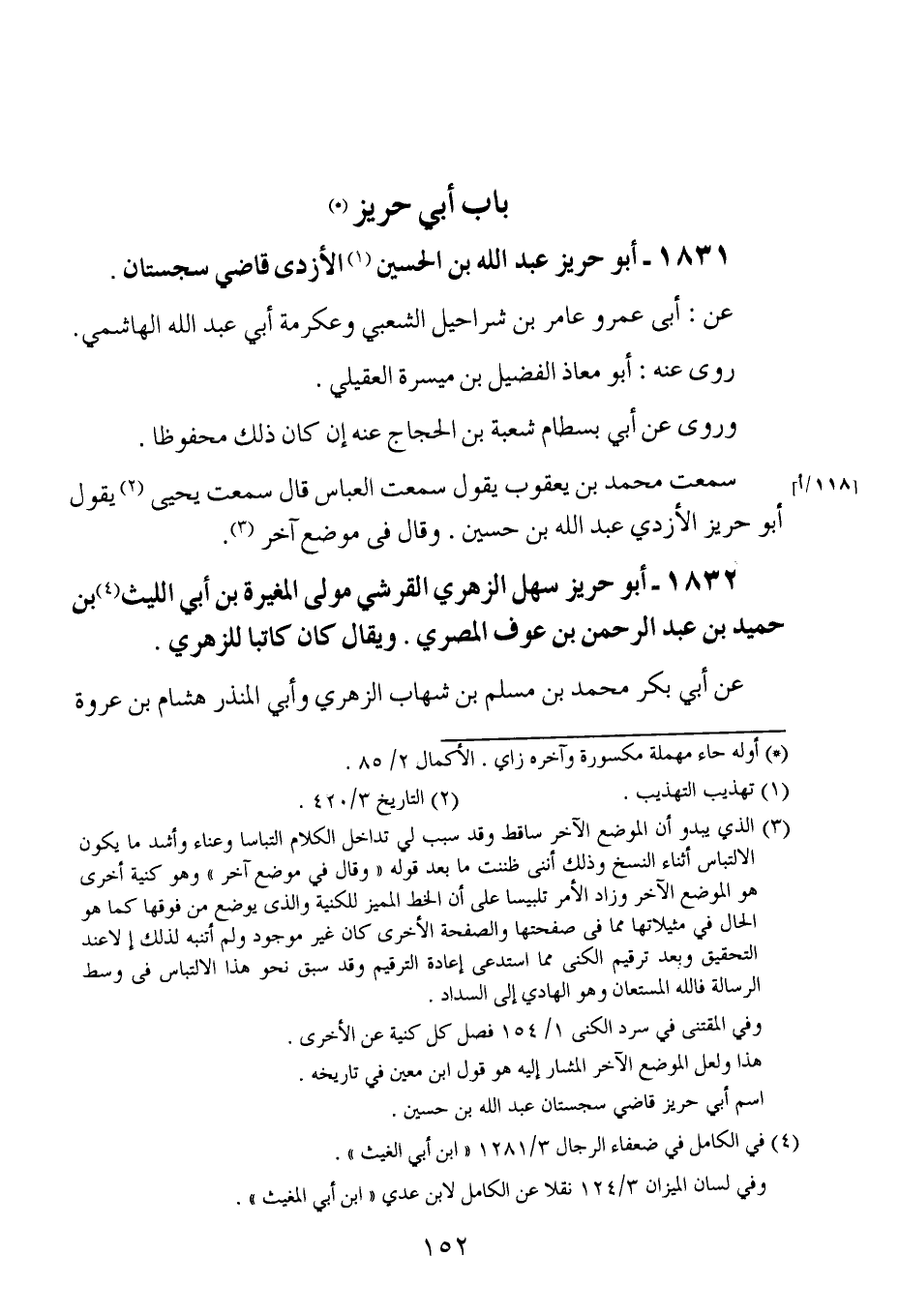 1831- أبو حريز عبد الله بن الحسين ، الأَزدِيّ قاضي سجستان.