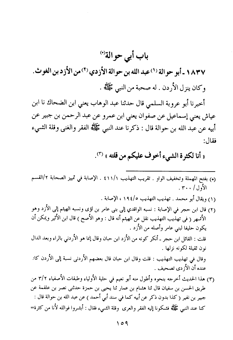 أخبرنا أبو عَرُوبَة السلمي ، قال : حَدَّثنا عبد الوهاب ، يَعنِي ابن الضحاك ، حَدَّثنا ابن عياش ، يَعني إسماعيل عن صفوان ، يَعنِي ابن عَمْرو عن عبد الرحمن بن جبير ، عَن أبيه عن عبد الله بن حوالة قال : ذكرنا عند النبي صلى الله عليه وسلم الفقر والغنى وقلة الشيء فقال : أنا لكثرة الشيء أخوف عليكم من قلته.