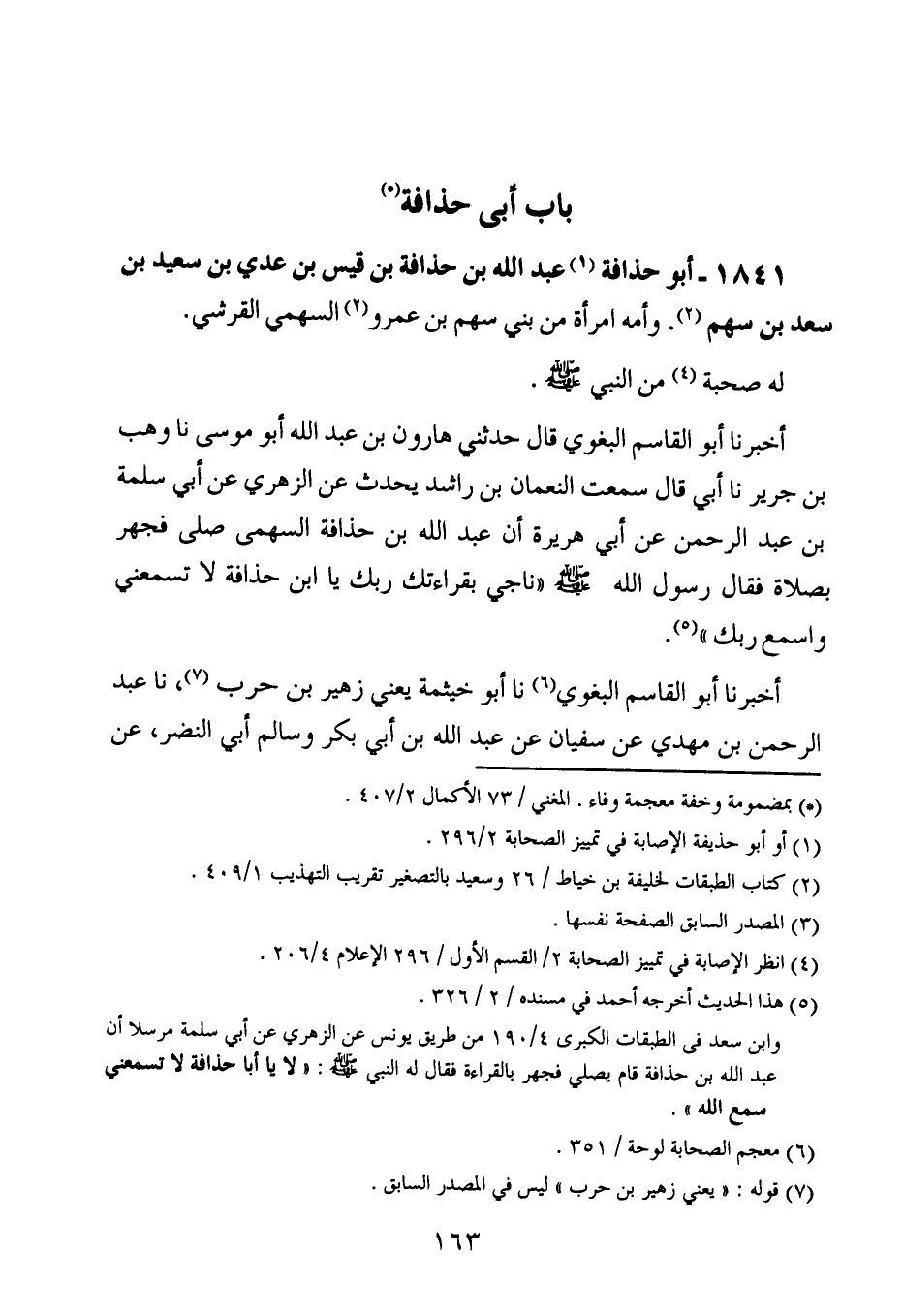 أخبرنا أبو القاسم البغوي ، قال : حَدَّثني هارون بن عبد الله أبو موسى ، حَدَّثنا وَهب بن جرير ، حَدَّثنا أبي ، قال : سَمِعتُ النعمان بن راشد يحدث ، عَن الزُّهْرِيّ عن أبي سلمة بن عبد الرحمن عن أبي هريرة أن عبد الله بن حذافة السهمي صلى فجهر بصلاة فقال رسول الله صلى الله عليه وسلم : ناجي بقراءتك ربك ياابن حذافة لا تسمعني واسمع ربك.
