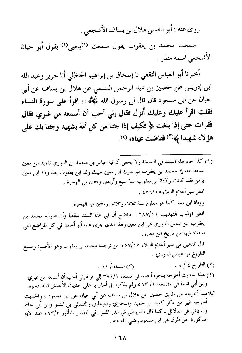 أخبرنا أبو العباس الثقفي ، حَدَّثنا إسحاق بن إبراهيم الحنظلي أخبرنا جرير وعبد الله بن إدريس عن حصين بن عبد الرحمن السلمي عن هلال بن يساف عن أبي حيان عن ابن مسعود ، قال : قال لي رسول الله صلى الله عليه وسلم : اقرأ علي سورة النساء اقرأ عليك وعليك أنزل فقال إني أحب أن أسمع من غيري فقال فقرآت حتى إذا بلغت ( فكيف إذا جئنا من كل أمة بشهيد وجئنا بك على هؤلاء شهيدا ) ففاضت عيناه.
