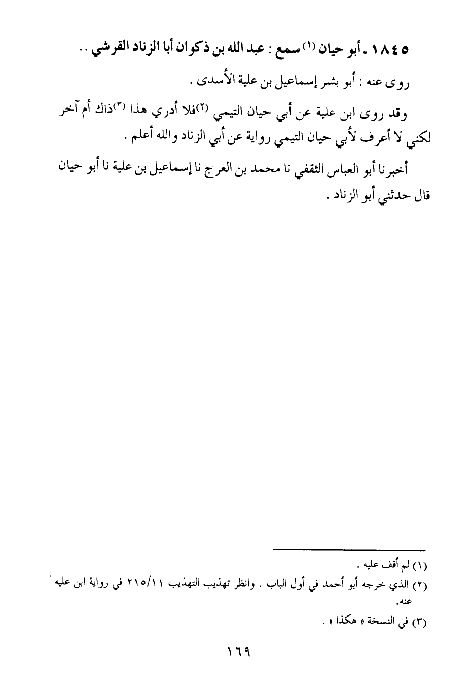 وقد روى ابن علية عن أبي حيان التيمي فلا أدري هذا ذاك أم آخر لكني لا أعرف لأبي حيان التيمي رواية عن أبي الزناد والله أعلم.