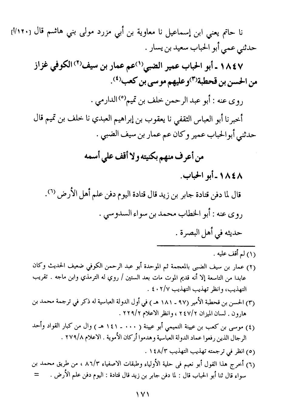 1847- أبو الحباب عُمَير الضبي عن عمار بن سيف الكوفي غزاز من الحسن بن قحطبة وعليهم موسى بن كعب.