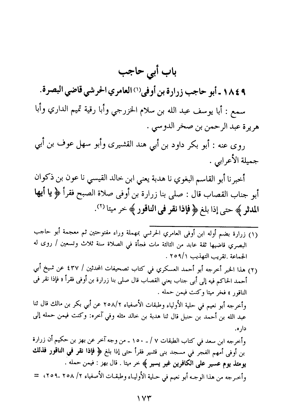 أخبرنا أبو القاسم البغوي ، حَدَّثنا هدبة ، يَعنِي ابن خالد القيسي ، حَدَّثنا عون بن ذكوان أبو جناب القصاب قال صلى بنا زرارة ابن أوفى صلاة الصبح فقرأ ( ياأيها المدثر ) حتى إذا بلغ ( فإذا نقر في الناقور ) خر ميتا.