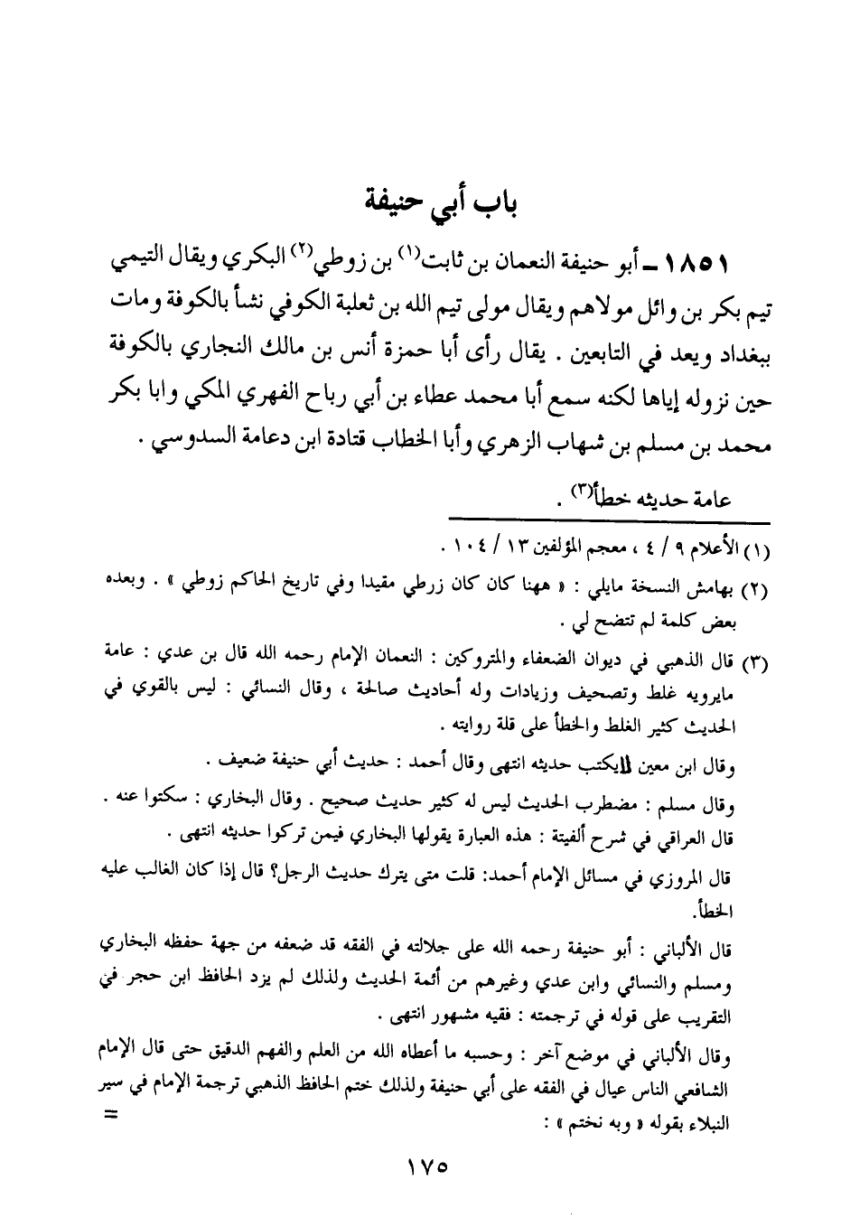 1851- أبو حنيفة النعمان بن ثابت بن زوطي البكري ، وَيُقَال : التيمي تيم بكر بن وائل مولاهم ، وَيُقَال : مولى تيم الله بن ثعلبة الكوفي نشأ بالكوفة ومات ببغداد ويعد في التابعين.