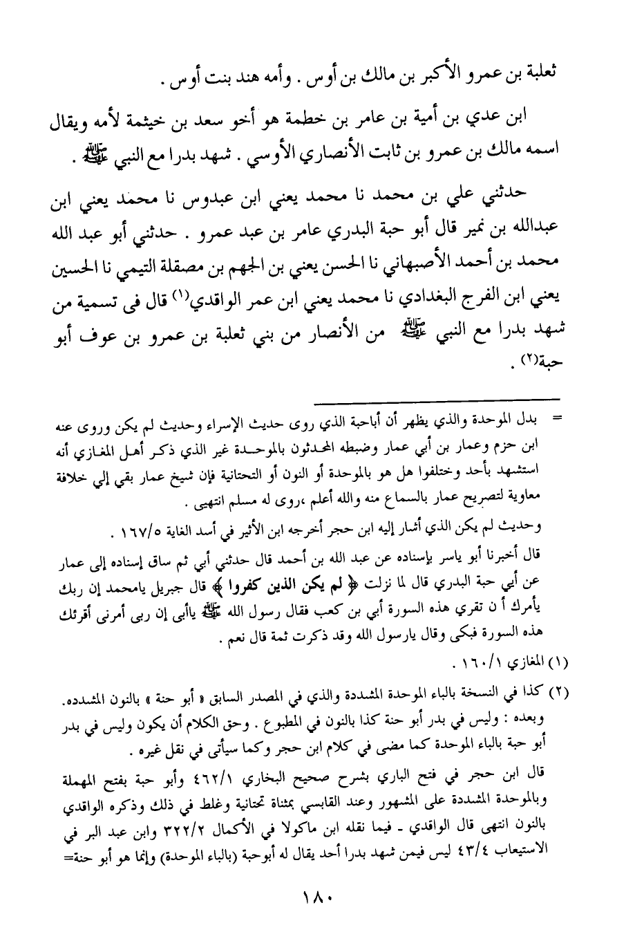 حدثني أبو عبد الله محمد بن أحمد الأصبهاني ، حَدَّثنا الحسن ، يَعنِي ابن الجهم بن مصقلة التيمي ، حَدَّثنا الحسين ، يَعنِي ابن الفرج البغدادي ، حَدَّثنا محمد ، يَعنِي ابن عُمَر الواقدي قال في تسمية من شهد بدرا مع النبي صلى الله عليه وسلم من الأنصار من بني ثعلبة بن عَمْرو بن عوف أبو حبة.