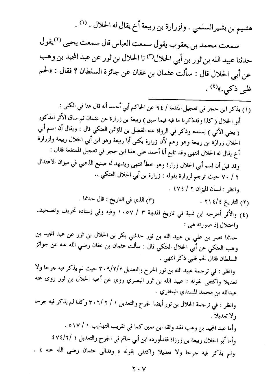 سمعت محمد بن يعقوب يقول : سَمِعتُ العباس ، قال : سَمِعتُ يحيى يقول حدثنا عبيد الله بن ثور بن أبي الحلال ، حَدَّثنا الحلال بن ثور عن عبد المجيد بن وَهب عن أبي الحلال قال سألت عثمان بن عفان عن جائزة السلطان ؟ فقال : لحم ظبي ذكي.