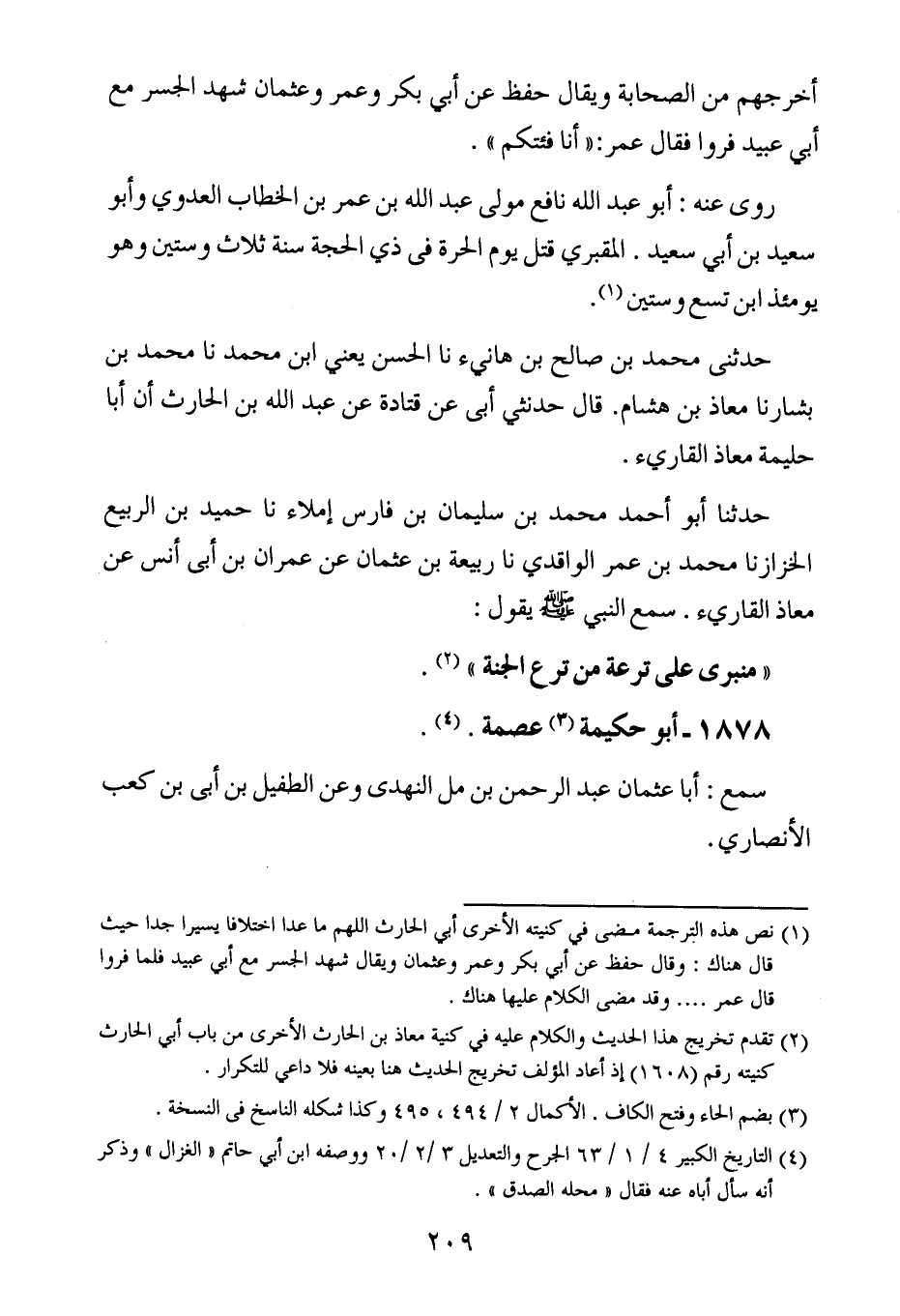 حدثنا أبو أحمد محمد بن سُليمان بن فارس إملاء ، حَدَّثنا حميد بن الربيع الخزاز ، حَدَّثنا محمد بن عُمَر الواقدي ، حَدَّثنا ربيعة بن عثمان عن عمران بن أبي أنس عن معاذ القارىء سمع النبي صلى الله عليه وسلم يقول : منبري على ترعة من ترع الجنة.