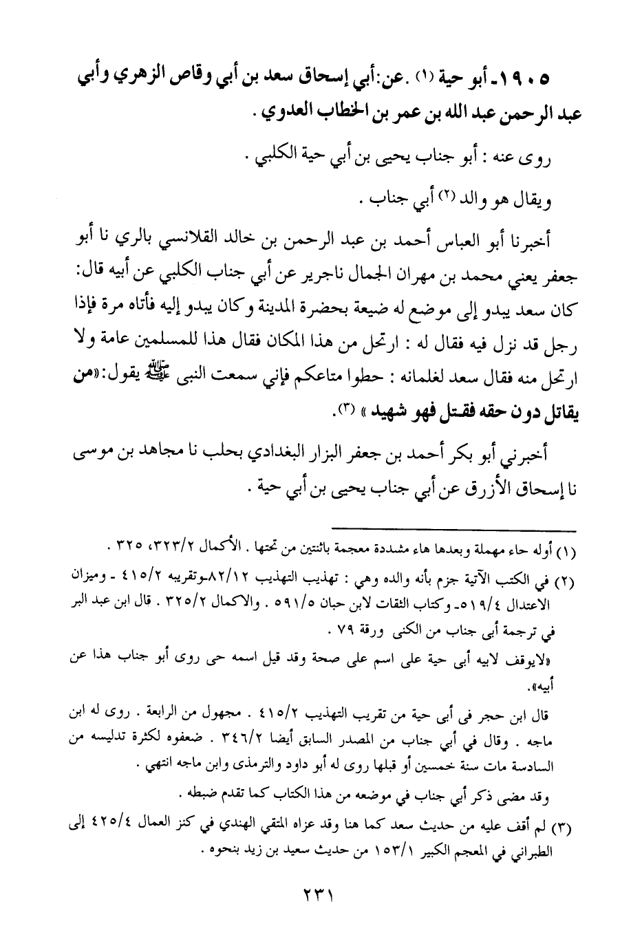 أخبرنا أبو العباس أحمد بن عبد الرحمن بن خالد القرنسي بالري ، حَدَّثنا أبو جعفر ، يَعني محمد بن مهران الجمال ، حَدَّثنا جرير عن أبي جناب الكلبي ، عَن أبيه قال : كان سعد يبدو إلى موضع له ضيعة بحضرة المدينة ، وكان يبدو إليه فأتاه مرة فإذا رجل قد نزل فيه فقال له : ارتحل من هذا المكان فقال هذا للمسلمين عامة ولا ارتحل منه فقال سعد لغلمانه : حطوا متاعكم فإني سمعت النبي صلى الله عليه وسلم يقول : من يقاتل دون حقه فقتل فهو شهيد.