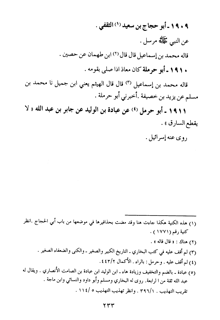1911 - أبو حرملة عن عبادة بن الوليد عن جابر بن عبد الله لا يقطع السارق.