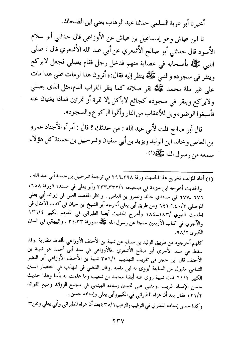 ، حَدَّثنا ابن عياش ، وَهُو إسماعيل بن عياش عن الأوزاعي ، قال : حَدَّثني أبو سلام الأسود ، قال : حَدَّثني أبو صالح الأشعري عن أبي عبد الله الأشعري قال : صلى النبي صلى الله عليه وسلم بأصحابه في عصابة منهم فدخل رجل فقام يصلي فجعل لا يركع وينقر في سجوده والنبي صلى الله عليه وسلم ينظر إليه فقال : أترون هذا لومات على هذا مات على غير ملة محمد صلى الله عليه وسلم نقر صلاته كما ينقر الغراب الدم مثل الذي يصلي ولايركع وينقر في سجوده كجائع لا يأكل إلا تمرة أو تمرين فماذا يغنيان عنه فأسبغوا الوضوء ويل للأعقاب من النار وأتموا الركوع والسجود.