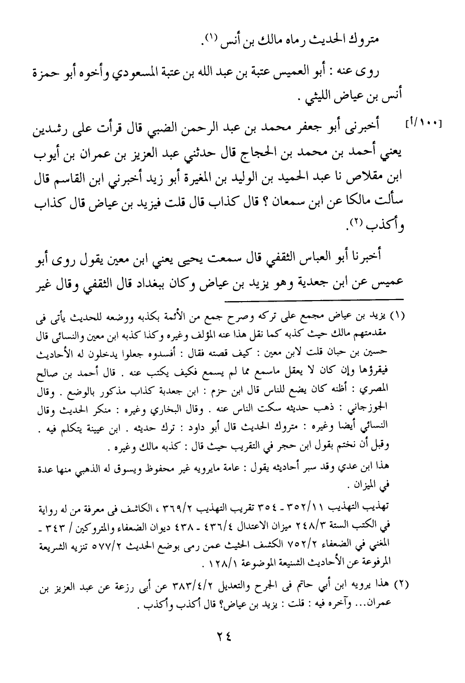 أخبرني أبو جعفر محمد بن عبد الرحمن الضبي قال قرأت على رشدين ، يَعني أحمد بن محمد بن الحجاج ، قال : حَدَّثني عبد العزيز بن عمران بن أيوب بن مقلاص ، حَدَّثنا عبد الحميد بن الوليد بن المغيرة أبو زيد أخبرني ابن القاسم قال سألت مالكا عن ابن سمعان ؟ قال كذاب قال قلت فيزيد بن عياض قال كذاب وأكذب.