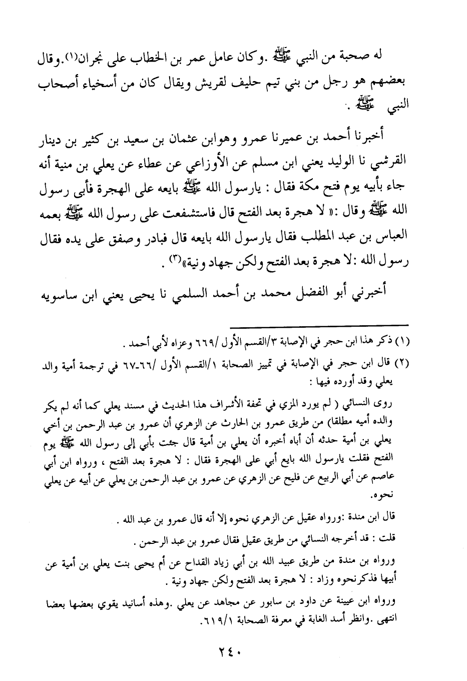 أخبرنا أحمد بن عُمَير عَمْرو ، وَهُو ابن عثمان بن سعيد بن كثير بن دينار القرشي ، حَدَّثنا الوليد ، يَعنِي ابن مسلم عن الأوزاعي عن عطاء عن يَعْلَى بْن مُنْيَةَ أنه جاء بأبيه يوم فتح مكة فقال : يارسول الله صلى الله عليه وسلم بايعه على الهجرة فأبي رسول الله صلى الله عليه وسلم وقال : لا هجرة بعد الفتح قال فاستشفعت على رسول الله صلى الله عليه وسلم بعمه العباس بن عبد المطلب فقال يارسول الله بايعه قال فبادر وصفق على يده فقال رسول الله : لا هجرة بعد الفتح ولكن جهاد ونية.