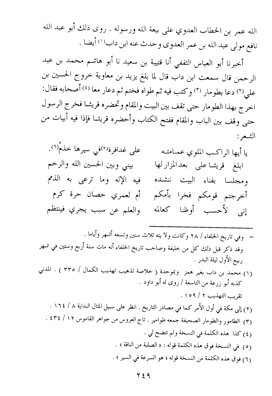 أخبرنا أبو العباس الثقفي أخبرنا قتيبة بن سعيد ، حَدَّثنا أبو هاشم محمد بن عبد الرحمن ، قال : سَمِعتُ ابن داب قال لما بلغ يزيد بن معاوية خروج الحسين بن علي دعا بطومار وكتب قيه ثم طواه فختم ثم دعا معا أصحابه فقال : اخرج بهذا الطومار حتى تقف بين البيت والمقام وتحضره قريشا فخرج الرسول حتى وقف بين الباب والمقام ففتح الكتاب وأحضره قريشا فإذا فيه أبيات من الشعر :