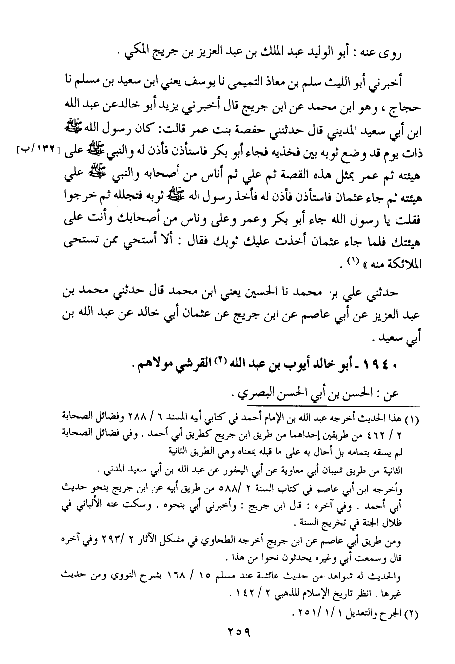 أخبرني أبو الليث سلم بن معاذ التميمي ، حَدَّثنا يوسف ، يَعنِي ابن سعيد بن مسلم ، حَدَّثنا حجاج ، وَهُو ابن محمد عن ابن جريج قال أخبرني يزيد أبو خالد عن عبد الله بن أبي سعيد المديني قال حدثتني حفصه بنت عُمَر قالت : كان رسول الله صلى الله عليه وسلم ذات يوم قد وضع ثوبه بين فخذيه فجاء أبو بكر فاستأذن فأذن له والنبي صلى الله عليه وسلم على هيئته ثم عُمَر بمثل هذه القصة ثم علي ثم أناس من أصحابه والنبي صلى الله عليه وسلم على هيئته ثم جاء عثمان فاستأذن فأذن له فأخذ رسول الله صلى الله عليه وسلم ثوبه فتجلله ثم خرجوا فقلت يارسول الله جاء أبو بكر ، وعُمَر وناس من أصحابك وأنت على هيئتك فلما جاء عثمان أخذت عليك ثوبك فقال : الا أستحي ممن يستحي الملائكة منه.