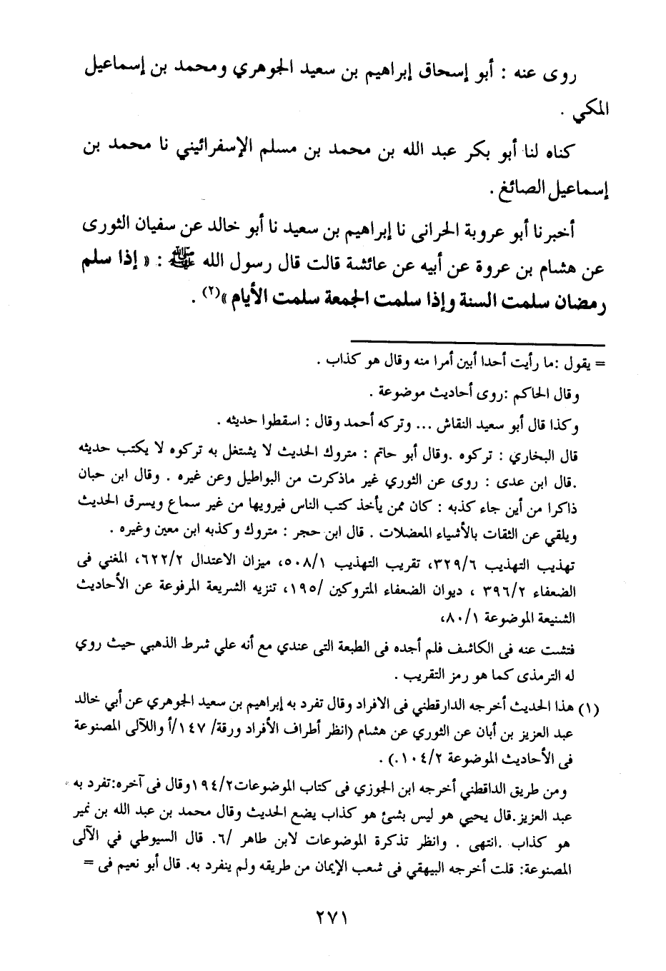 أخبرنا أبو عَرُوبَة الحراني ، حَدَّثنا إبراهيم بن سعيد ، حَدَّثنا أبو خالد عن سفيان الثوري عن هشام بن عروة ، عَن أبيه عن عائشة قالت قال رسول الله صلى الله عليه وسلم : إذا سلم رمضان سلمت السنة وإذا سلمت الجمعة سلمت الأيام.