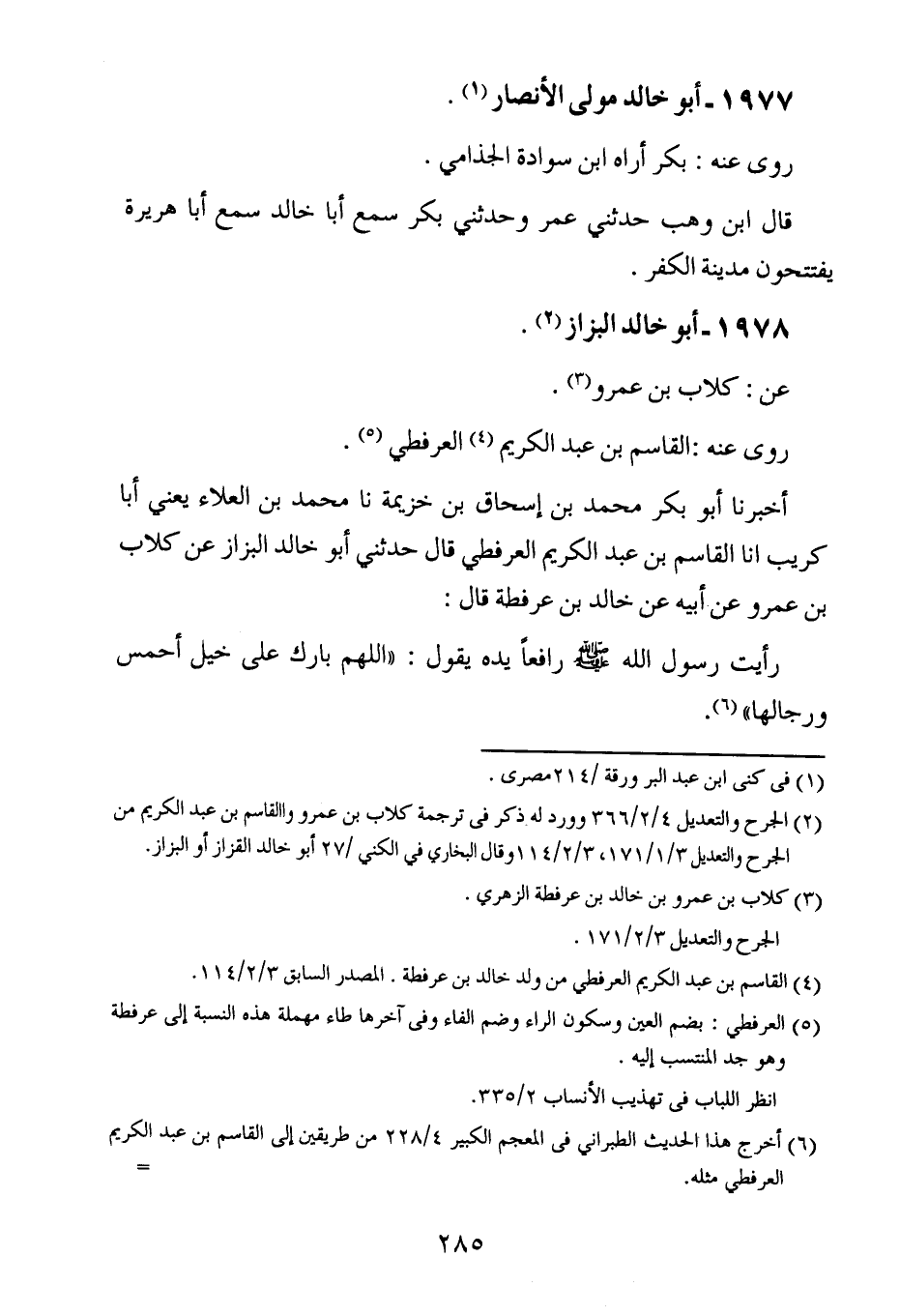 أخبرنا أبو بكر محمد بن إسحاق بن خزيمة ، حَدَّثنا محمد بن العلاء ، يَعني أبا كريب أخبرنا القاسم بن عبد الكريم العرفطي ، قال : حَدَّثني أبو خالد البزاز عن كلاب بن عَمْرو ، عَن أبيه عن خالد بن عرفطة قال : رأيت رسول الله صلى الله عليه وسلم رافعا يده يقول : اللهم بارك على خيل أحمس ورجالها.