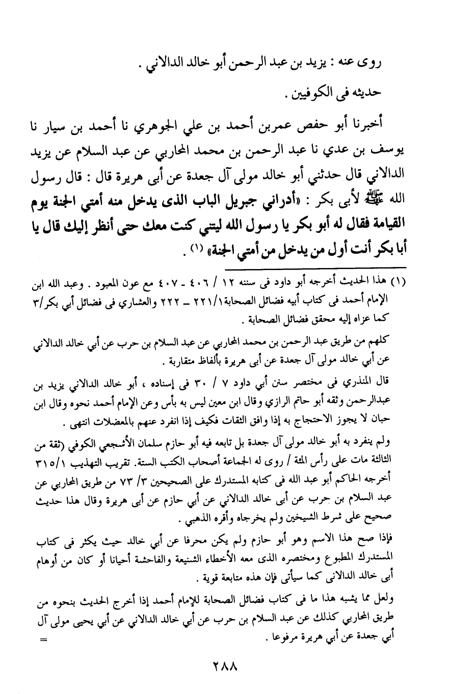 أخبرنا أبو حفص عُمَر بن أحمد بن علي الجوهري ، حَدَّثنا أحمد بن سيار ، حَدَّثنا يوسف بن عدي ، حَدَّثنا عبد الرحمن بن محمد المحاربي عن عبد السلام عن يزيد الدالاني ، قال : حَدَّثني أبو خالد مولى آل جعدة عن أبي هريرة قال : قال رسول الله صلى الله عليه وسلم : أدراني جبريل الباب الذي يدخل منه أمتي الجنة يوم القيامة فقال له أبو بكر يارسول الله ليتني كنت معك حتى أنظر إليك قال ياأبا بكر أنت أول من يدخل من أمتي الجنة.