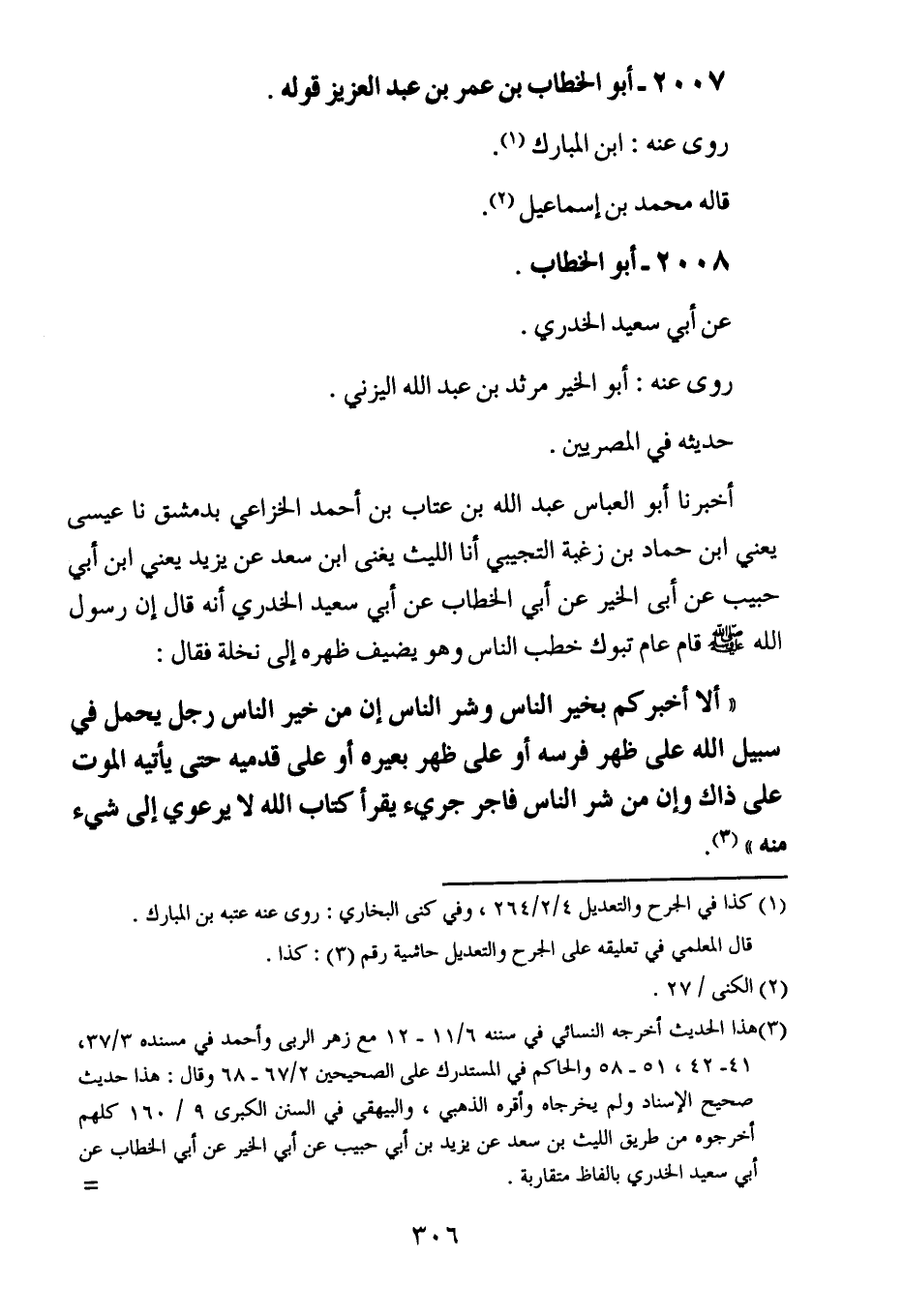 أخبرنا أبو العباس عبد الله بن عتاب بن أحمد الخزاعي بدمشق ، حَدَّثنا عيسى ، يَعنِي ابن حماد بن زغبة التجيبي أخبرنا الليث ، يَعنِي ابن سعد عن يزيد ، يَعنِي ابن أبي حبيب عن أبي الخير عن أبي الخطاب عن أبي سعيد الخدري أنه قال إن رسول الله صلى الله عليه وسلم قام عام تبوك خطب الناس ، وَهُو يضيف ظهره إلى نخلة فقال : ألا أخبركم بخير الناس وشر الناس إن من خير الناس رجل يحمل في سبيل الله على ظهر فرسه أو على ظهر بعيرة أو على قدميه حتى يأتيه الموت على ذاك وإن من شر الناس فاجر جرىء يقرأ كتاب لا يرعوي إلى شيء منه.
