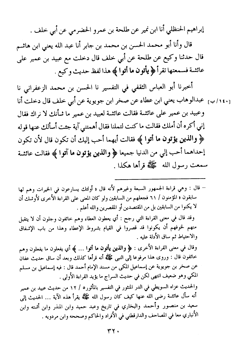 أخبرنا أبو العباس الثقفي في التفسير ، حَدَّثنا الحسن بن محمد الزعفراني ، حَدَّثنا عبد الوهاب ، يَعنِي ابن عطاء عن صخر بن جويرية عن أبي خلف قال دخلت أنا وعبيد بن عُمَير على عائشة فقالت عائشة لعبيد بن عُمَير ما شأنك لا نراك فقال إني أكره أن أملك فقالت ما كنت لتملنا فقال اهمتني آية جئت أسألك عنها قوله ( والذين يؤتون ما أتوا ) فقالت أيهما أحب إليك أن تكون قال لأن تكون إحداهما أحب إلي من الدنيا جميعا ( والذين يؤتون ما آتوا ) فقالت عائشة سمعت رسول الله صلى الله عليه وسلم قرأها هكذا.