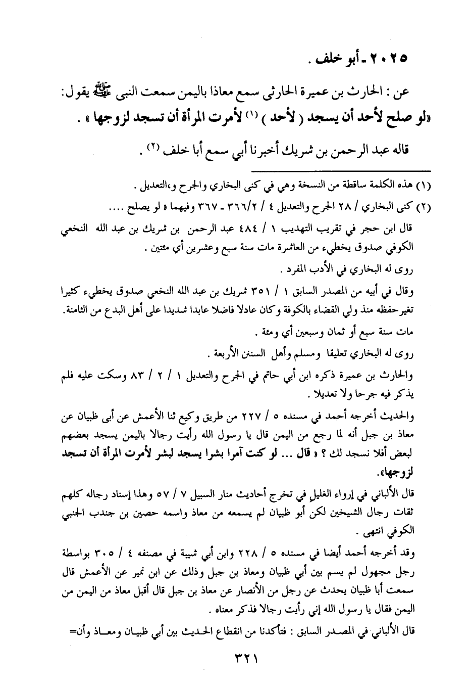 عن الحارث بن عميرة الحارثي سمع معاذا باليمن سمعت النبي صلى الله عليه وسلم يقول : لو صلح لأحد أن يسجد لأحد لأمرت المرأة أن تسجد لزوجها.
