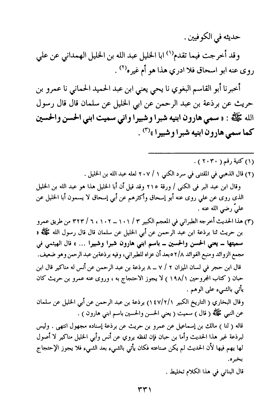 أخبرنا أبو القاسم البغوي ، حَدَّثنا يحيى ، يَعنِي ابن عبد الحميد الحماني ، حَدَّثنا عَمْرو بن حريث عن برذعة بن عبد الرحمن عن أبي الخليل عن سلمان ، قال : قال رسول الله صلى الله عليه وسلم : سمي هارون ابنيه شبرا وشبيرا وإني سميت ابني الحسن والحسين كما سمي هارون ابنيه شبرا وشبيرا.
