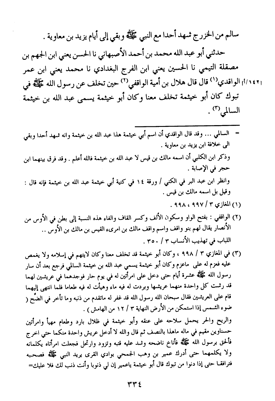 حدثني أبو عبد الله محمد بن أحمد الأصبهاني ، حَدَّثنا الحسن ، يَعنِي ابن الجهم بن مصقلة التيمي ، حَدَّثنا الحسين ، يَعنِي ابن الفرج البغدادي ، حَدَّثنا محمد ، يَعنِي ابن عُمَر الواقدي ، قال : قال هلال بن أمية الواقفي حين تخلف عن رسول الله صلى الله عليه وسلم في تبوك كان أبو خيثمة تخلف معنا ، وكان أبو خيثمة يسمى عبد الله بن خيثمة السالمي.