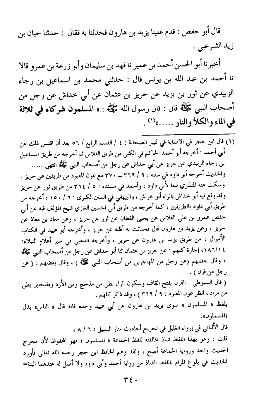 أخبرنا أبو الحسن أحمد بن عُمَير ، حَدَّثنا فهد بن سُليمان ، وَأبُو زُرْعَة بن عَمْرو قالا ، حَدَّثنا أحمد بن عبد الله بن يونس قال : حدثني محمد بن إسماعيل بن رجاء الزبيدي عن ثور بن يزيد عن حريز بن عثمان عن أبي خداش عن رجل من أصحاب النبي صلى الله عليه وسلم قال : قال رسول الله صلى الله عليه وسلم : المسلمون شركاء في ثلاثة في الماء والكلأ والنار.