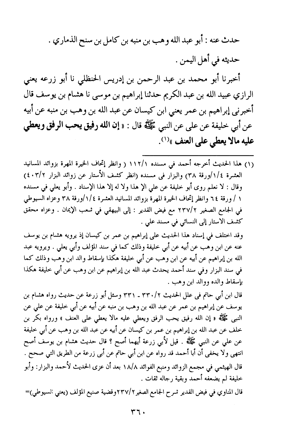 أخبرنا أبو محمد بن عبد الرحمن بن إدريس الحنظلي ، حَدَّثنا أبو زُرْعَة ، يَعني الرازي عبيد الله بن عبد الكريم حدثنا إبراهيم بن موسى ، حَدَّثنا هشام بن يوسف قال أخبرني إبراهيم بن عُمَر ، يَعنِي ابن كيسان عن عبد الله بن وَهب بن منبه ، عَن أبيه عن أبي خليفة عن علي عن النبي صلى الله عليه وسلم قال : إن الله رفيق يحب الرفق ويعطي عليه مالا يعطي على العنف.