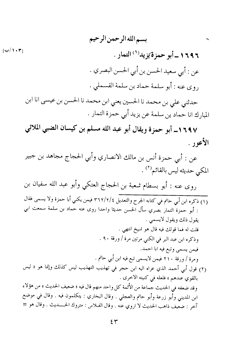 حدثني علي بن محمد ، حَدَّثنا الحسين ، يَعنِي ابن محمد ، حَدَّثنا الحسن بن عيسى انا ابن المبارك انا حماد بن سلمة عن يزيد أبي حمزة التمار.