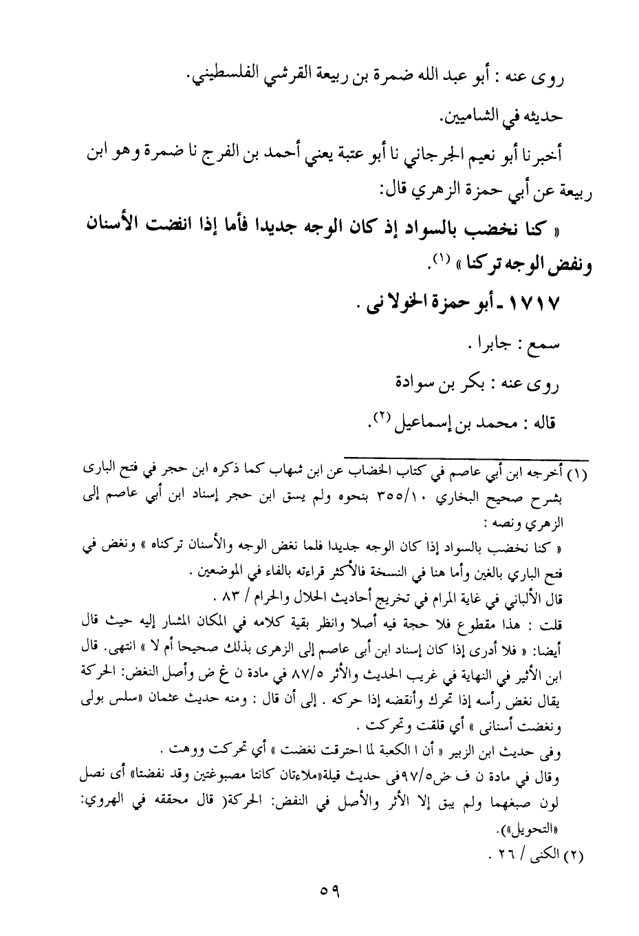 أخبرنا أبو نعيم الجرجاني ، حَدَّثنا أبو عتبة ، يَعني أحمد بن الفرج ، حَدَّثنا ضمرة ، وَهُو ابن ربيعة عن أبي حمزة الزهري قال : كنا نخضب بالسواد إذا كان الوجه جديدا فأما إذا انفضت الأسنان ونفض الوجه تركنا.