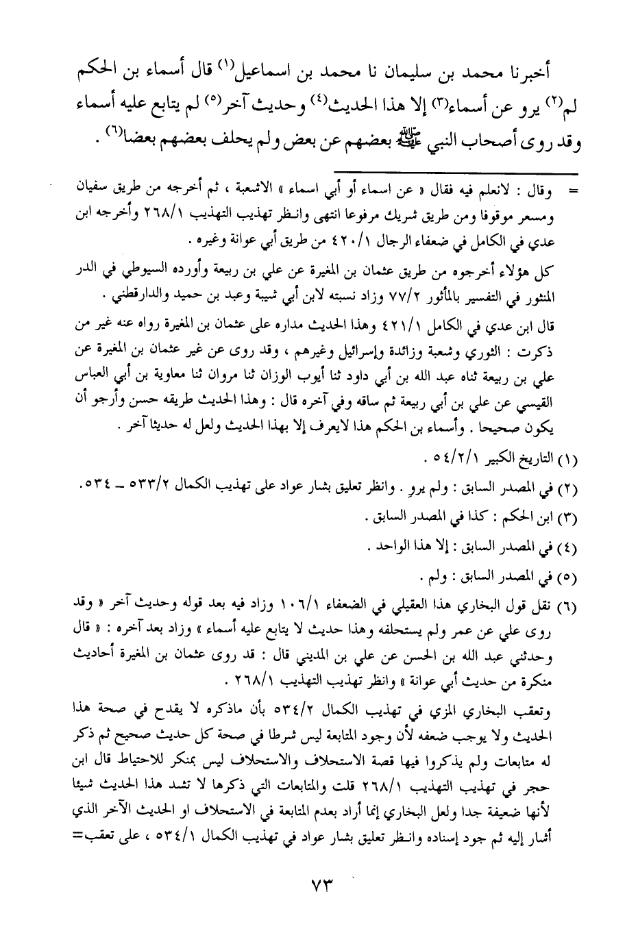 أخبرنا محمد بن سُليمان ، حَدَّثنا محمد بن إسماعيل قال أسماء بن الحكم لم يرو عن أسماء إلا هذا الحديث وحديث آخر لم يتابع عليه أسماء وقد روى أصحاب النبي صلى الله عليه وسلم بعضهم عن بعض ولم يحلق بعضهم بعضا.