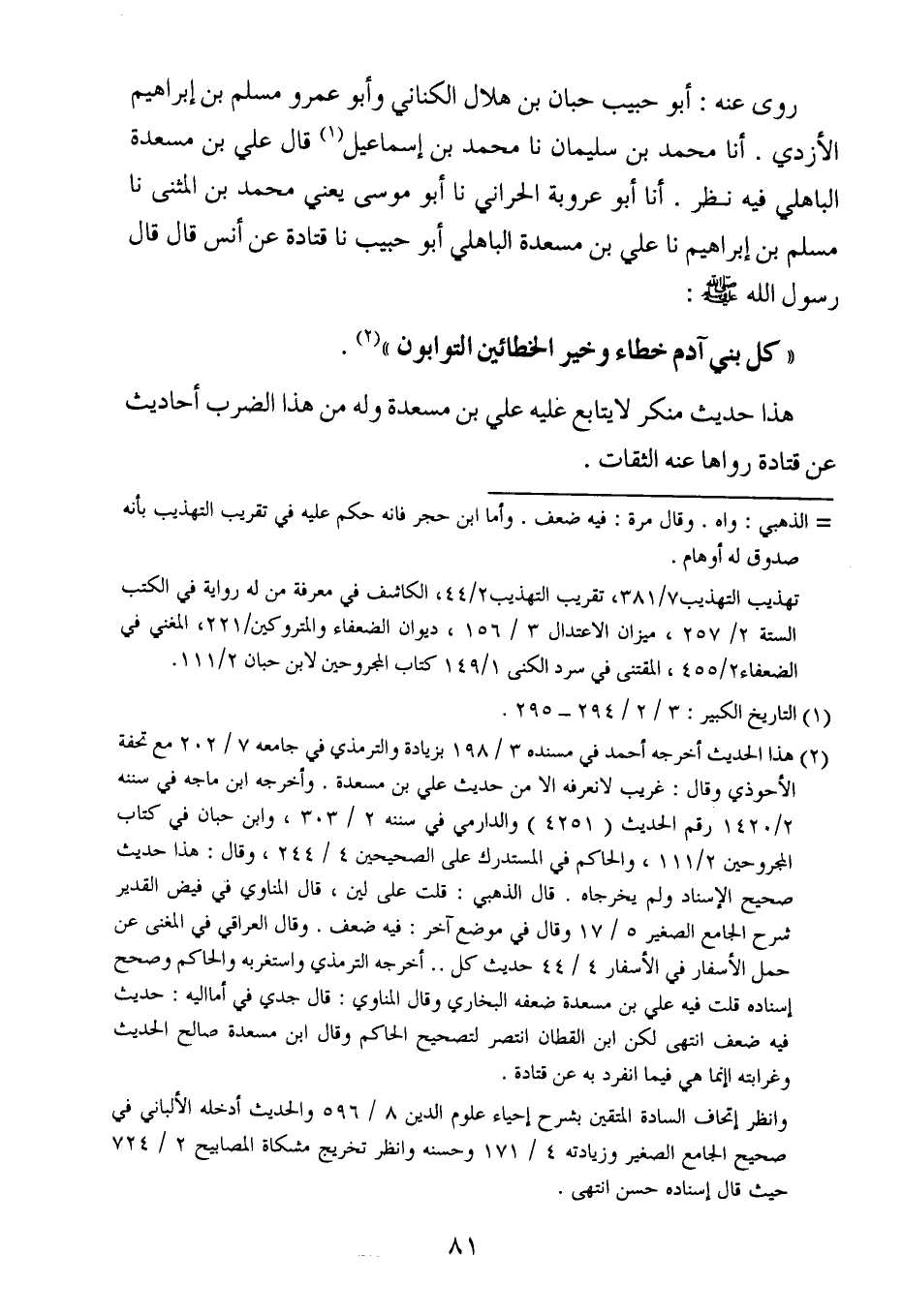 أَخْبَرنا أبو عَرُوبَة الحراني ، حَدَّثنا أبو موسى ، يَعني محمد بن المثنى ، حَدَّثنا مسلم بن إبراهيم ، حَدَّثنا علي بن مسعدة الباهلي أبو حبيب ، حَدَّثنا قتادة ، عَن أَنس ، قال : قال رسول الله صلى الله عليه وسلم : كل بني آدم خطاء وخير الخطائين التوابون.