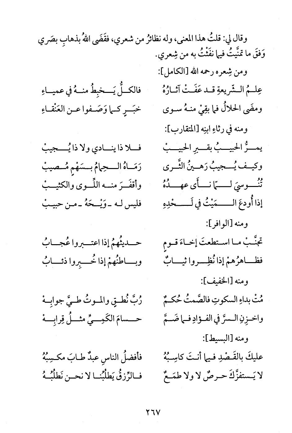 وقال في: قلتُ هذا المعنى، وله نظائرُ من شعري، فقَضَى اللهُ بذهابِ بصَري وَفقَ ما تمنَّيتُ فيما نفَثْتُ به من شِعري.